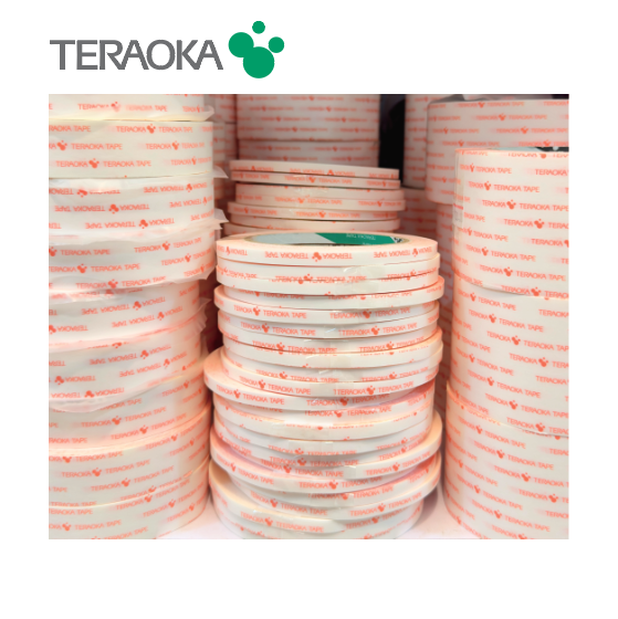 離型紙上印有紅色的寺岡logo,雙面膠帶的顏色為半透明。